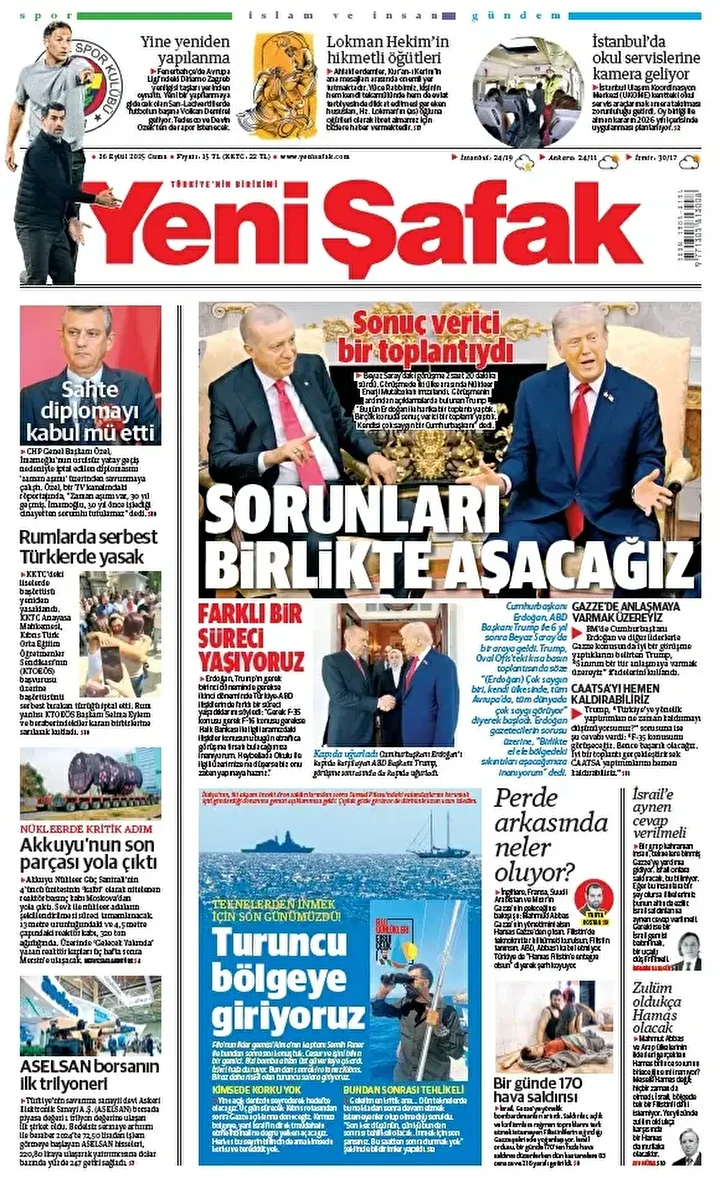 Yeni Şafak Gazetesi’nin 26 Eylül 2025 tarihli birinci sayfasında yer alan manşet ve haberler…