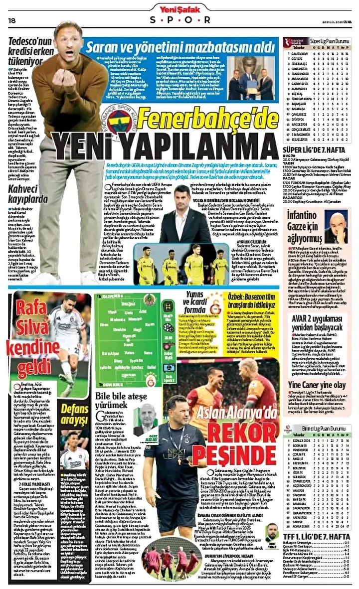 Fenerbahçe’de UEFA Avrupa Ligi’nde alınan Dinamo Zagreb yenilgisi taşları yerinden oynatacak. Sorunu, Samandıra’daki disiplinsizlik olarak tespit eden başkan Saran, eski futbolculardan Volkan Demirel ile futbol operasyonunun başına geçmesi için görüştü. Tedesco ve Özek’ten de acilen rapor alınacak.
